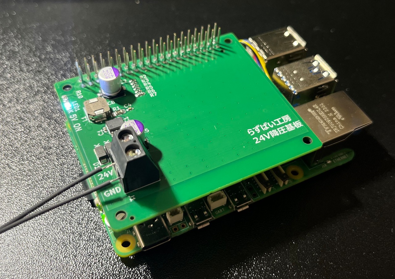 本製品は、24Vの入力電圧を5Vに降圧し、GPIOピンを介してRaspberry Piへ電源を供給するHAT(Hardware Attached on Top)基板です。これにより、Raspberry Pi本体のUSB-Cポートからの電源供給は不要となります。ご使用にあたり、Raspberry Pi側での特別な設定は必要ありません。